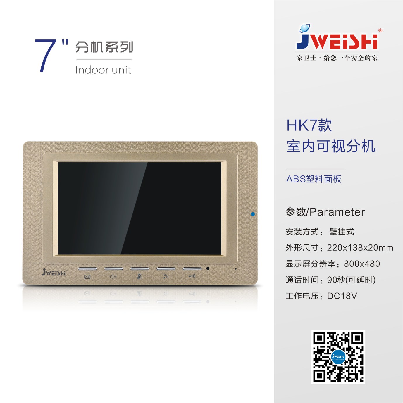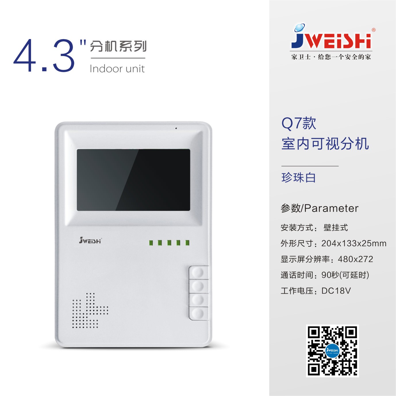 显示屏:7寸TFT显示屏分辨率:800*480安装方式:壁挂式 外形尺寸:220*138*20(mm)振铃时间:30秒通话时间:90秒(可延时)