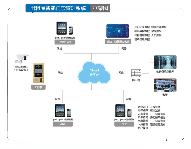 智能设备的使用联动,同时通过远程数据统计,实现智慧管理,房东更配合,流动人口