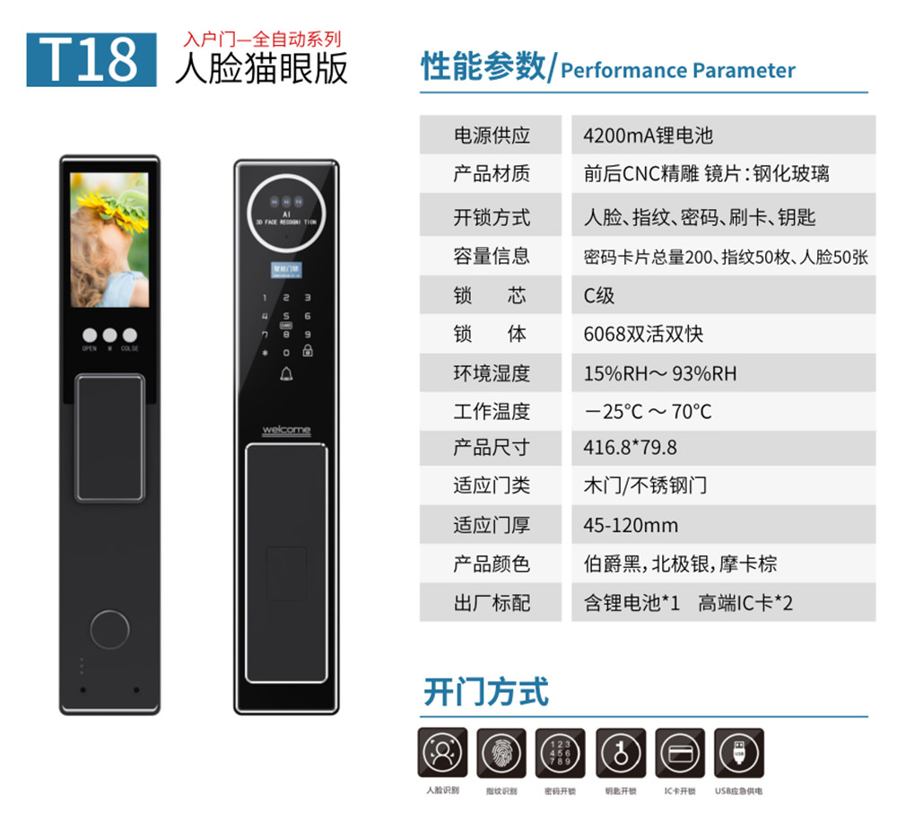- 猫眼、防撬报警、虚位密码防窥视、延时自动上锁、逗留抓拍、主动监控、低电量报警、AI语音提示、支持多国语言